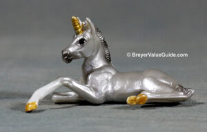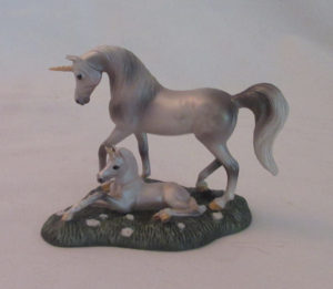 Porcelain unicorn mare and foal on base; metallic light silver; BreyerFest SR; 1/725