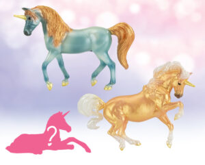 Iridescent pink pinto, gold horn and hooves, initially released by Tractor Supply - with Twist and Warmblood Mare