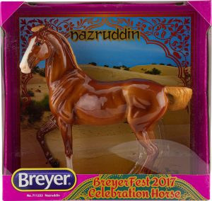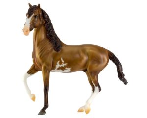 Matte chestnut, blaze with white muzzle, 1 front stocking, 2 low hind socks, BreyerFest Celebration model