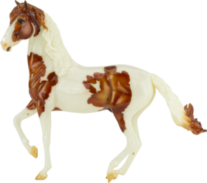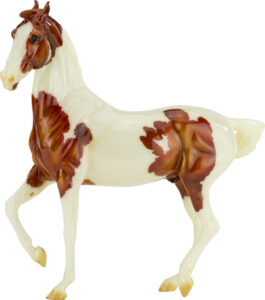 Glossy bright chestnut pinto, wide blaze over muzzle, straight ears, white legs, bi-color mane and tail, BreyerFest SR, 1/1000 Barb version