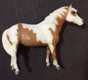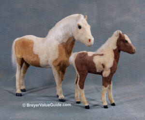 Matte palomino pinto; white mane/tail; palomino circle on right eye; 4 high white stockings - With Stormy; Paul Beebe doll and paperback