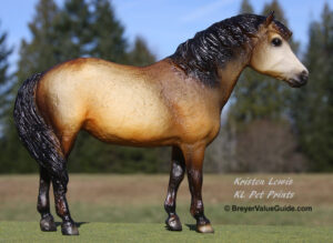 Glossy palomino pinto; white mane/tail; palomino circle on right eye; 4 short socks; original Misty pinto pattern