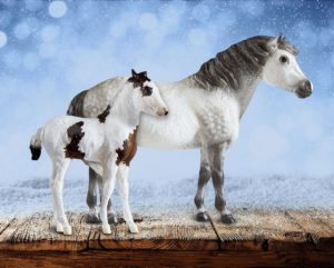 Matte shaded grey; white snip; pink shaded muzzle; white mane and tail; 3 socks; includes holiday sleigh; Holiday SR