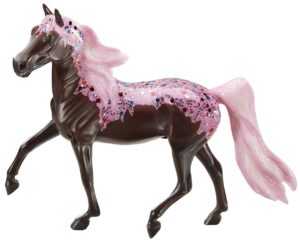 Iridescent pink; rainbow mane/ tail; silver hooves; added silver glitter horn