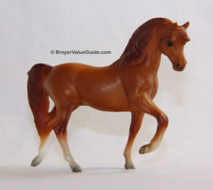 Matte dark chestnut; darker mane and tail; 1 hind sock; JCPenney SR