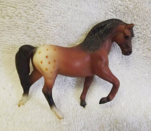Matte red bay blanket appaloosa; black mane and tail; black points; hind socks; JCPenney SR