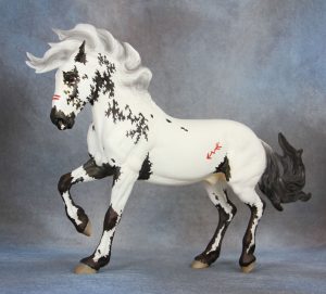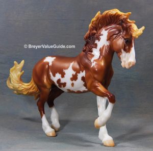 Matte buckskin overo pinto, bald face, bi-color mane, 1 white front leg, 1 hind sock, BreyerFest Raffle SR