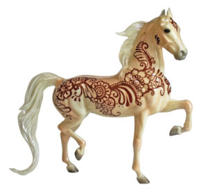 Glossy light palomino with gold highlights, brown "henna" decorator designs on sides and face. BreyerFest SR, 1/800