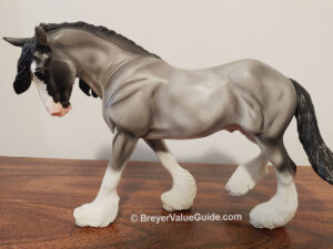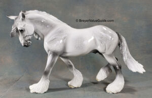Porcelain, glazed fine bisque, satin finish, light shaded grey, subtle dapples, 4 socks; BreyerFest Volunteer SR; 90-100 produced