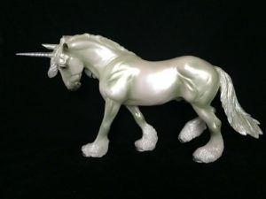 Pearly blue with silver horn and hooves, glitter in mane and tail, Web SR, 1/350
