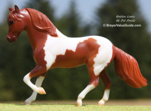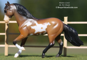 Matte chestnut pinto; flaxen mane and tail; stenciled bald face; feather in mane; 4 socks