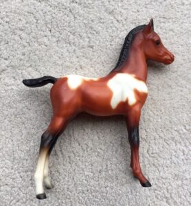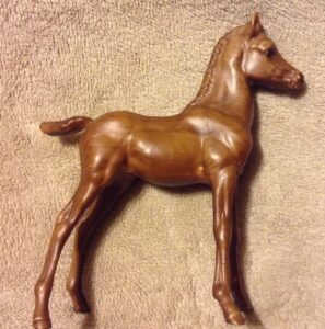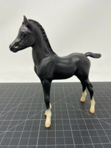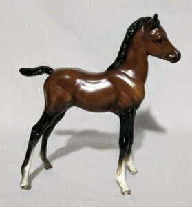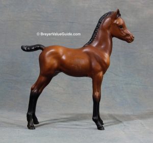 Matte chestnut/bay; stripe; black mane and tail; hind socks; JCPenney SR - with Action Stock Horse Foal; Suckling Foal; Running Foal
