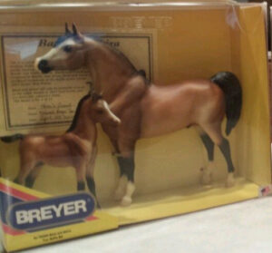 Matte bay; stripe to muzzle; no socks; JCPenney SR - with Proud Arabian Mare; Standing Stock Horse Foal; Phantom Wings