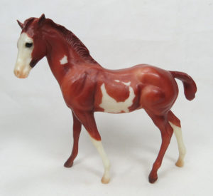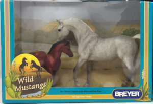 QH Stallion: Matte grey pinto; pink shaded muzzle; stenciled bald face; leg barring; 4 socks; QH Mare: Matte bay pinto; pink shaded muzzle; eye whites; black mane with white streak; black tail; 1 hind sock; QH Foal: Matte grullo pinto; broken blaze; pink muzzle; 1 front sock; 1 hind stocking; black mane with white streak; black tail; Blue Ribbon Sticker; Vintage Club SR; 1/500 Valued as set.
