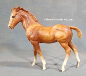 Matte chestnut; bald face; lighter or darker mane and tail; stockings; Chalky variations known