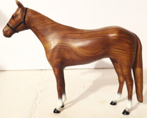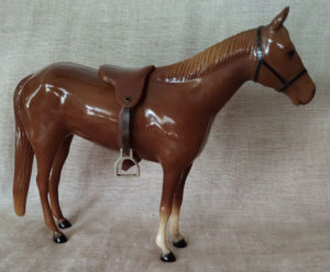 Glossy chestnut; bald face; various stockings. Some included hard plastic saddle