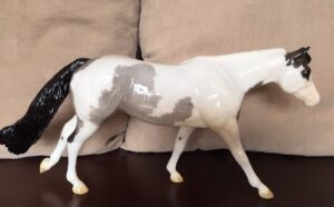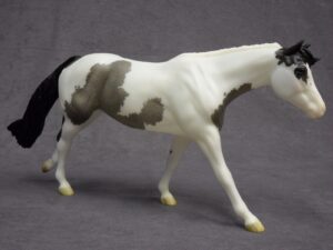 Glossy blue roan medicine hat pinto; mostly white; blue eyes; black tail; striped hooves; Breyerfest SR; 1/84