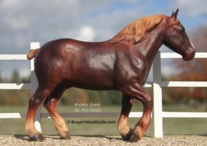 Matte chestnut; dappled; stenciled blaze and 4 socks; grey hooves; "BreyerFest 2010" stamped on belly; BreyerFest SR; 1/750