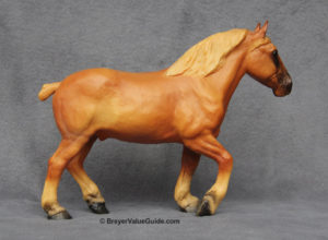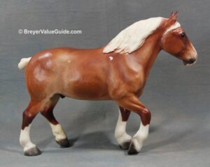 Matte dark sorrel; broad blaze; lower legs are light chestnut; Sears SR; - with Belgian and Shire