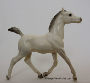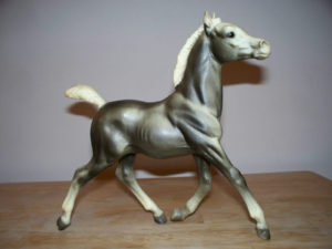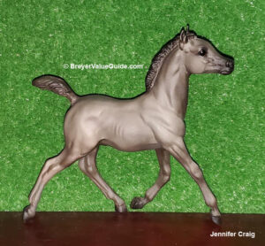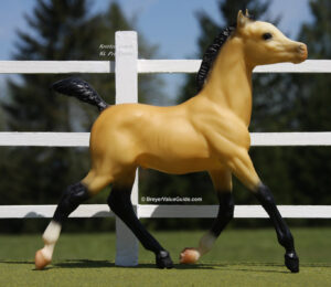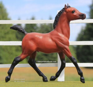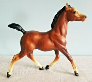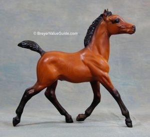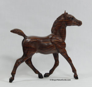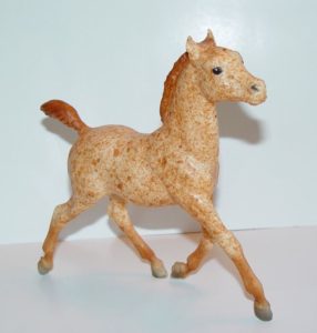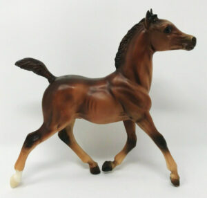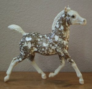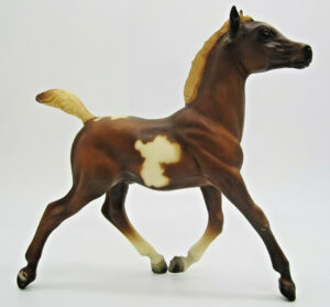Nestling Foal - glossy brown bay pinto, stripe-snip, bi-color mane and tail, white legs, hoof stripes