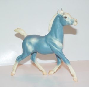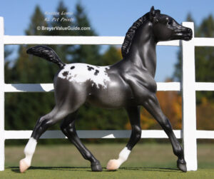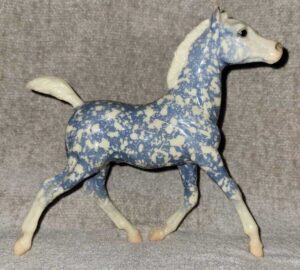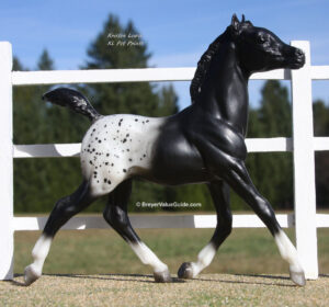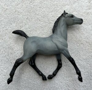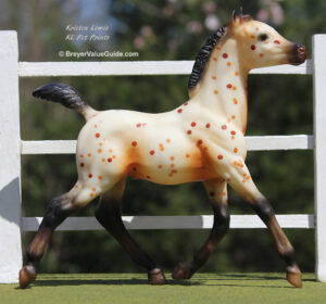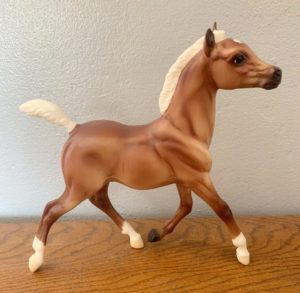 Robin Mare - glossy red bay pinto, stenciled apron face, kissy spot, bi-color mane and tail, white legs, hoof stripes, “Robin and Nestling 2022” on belly