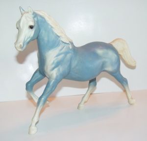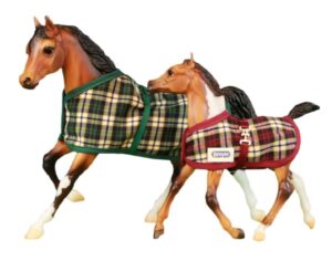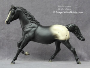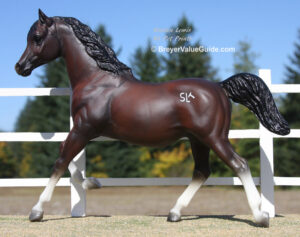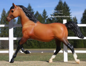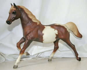 Robin Mare - glossy red bay pinto, stenciled apron face, kissy spot, bi-color mane and tail, white legs, hoof stripes, “Robin and Nestling 2022” on belly