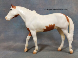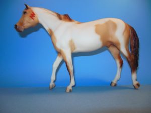 Matte light dun/chestnut pinto; blaze; red lightning bolt on left cheek; early models have brown bi-colored eyes; Collector's Edition