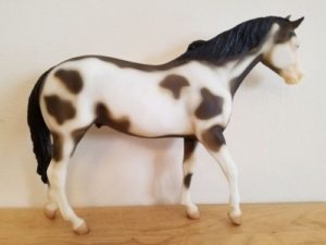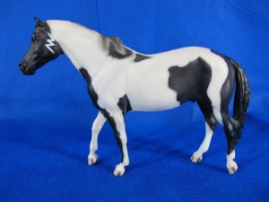 Matte black pinto; blaze; white lightning bolt on left cheek; early models have brown bi-colored eyes; Collector's Edition