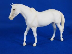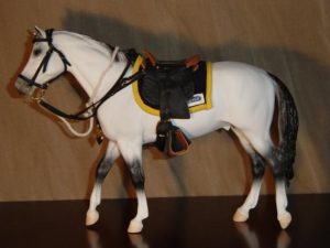 Matte grey with white base coat (chalky;) black points; 4 socks; tan hooves; included McClellan Cavalry Saddle Set; QVC SR