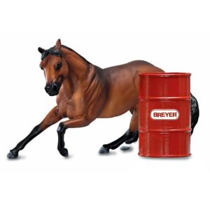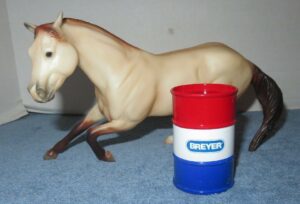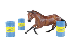 Semigloss bay, solid face, 1 hind sock, re-release of #477 with "Off to the Races" hang tag and three blue, BreyerFest branded barrels,