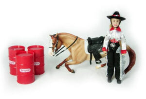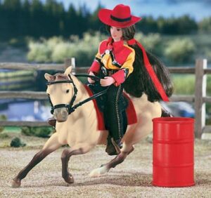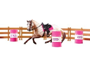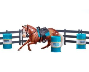 Matte palomino paint, wide blaze over muzzle, includes western tack, fencing and 3 blue barrels