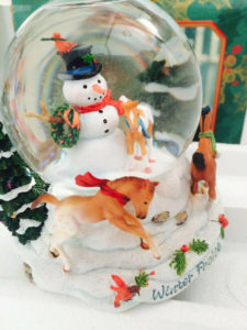 Matte chestnut blanket appaloosa; brown hooves; on snowglobe