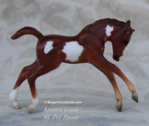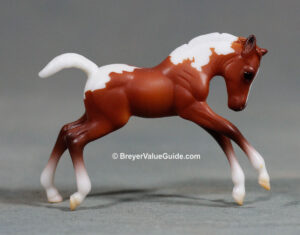 Matte chestnut pinto; extended blaze; 2 hind socks; Target release