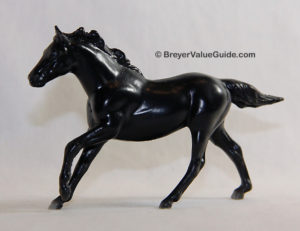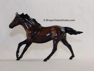 Matte to semigloss dark bay; black mane and tail; black points; some have socks