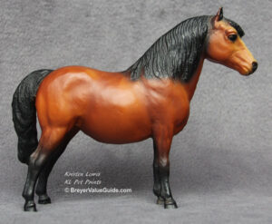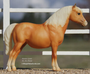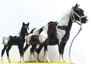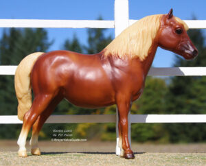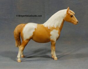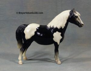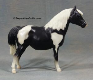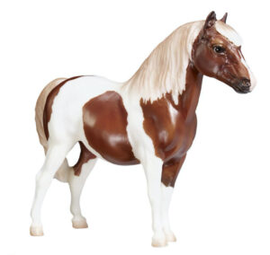 Glossy light chestnut pinto; white mane; chestnut tail; bald face; most are glossy but semi-gloss and matte models are known.