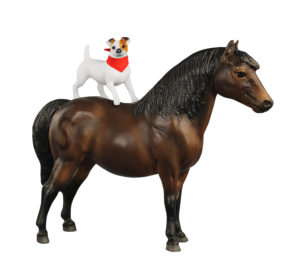 Matte shaded dark bay; large clipped "S" on hip; no white; BreyerFest SR; 1/750 - with Jack Russell Terrier