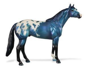 Metallic blue appaloosa; broken blaze with snip; darker legs; 1 front sock; blue hooves; Web SR; 1/500