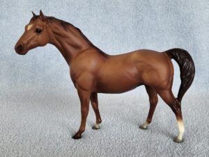 Matte chestnut; darker mane and tail; star; 1 hind sock; Hobby Centre Toys SR; 1/1000