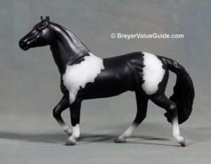 Matte chestnut pinto, stenciled bald face, 1 hind sock, variations with and without forearm spot, Vintage Club bonus Stablemate SR, 1/500 total
