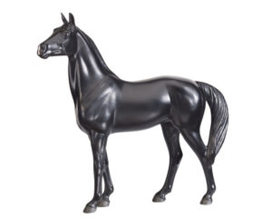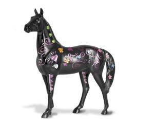 Matte black pinto, star, white mane and tail, white legs with natural hooves, includes "National Velvet" book