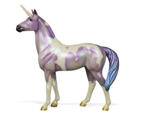 Pearlescent lavender pinto; unicorn horn; white legs; gold hooves; Web SR; includes blanket