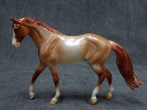 Matte strawberry roan; stenciled bald face; darker shaded points; 2015 Horse of the Year