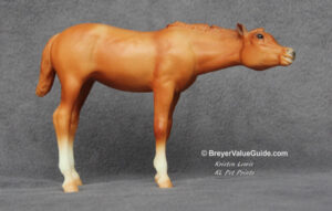 Glossy shaded light chestnut; flaxen mane and tail; bald face (mare), grey hooves; Sunshine Celebration SR; 1/4