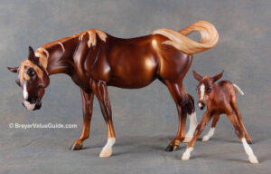 Mare: Matte chestnut; stripe; snip; 3 socks