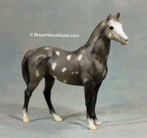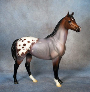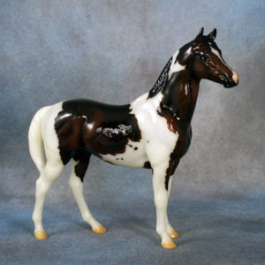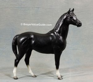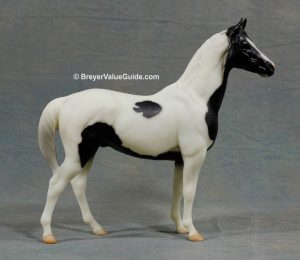 Semigloss black; stenciled bald face; bi-color eyes; low socks; striped hooves; B Ranch Series