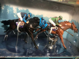 Matte black; painted on white leg wraps; star-broken stripe; with tack and jockey