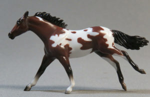 Matte dark bay pinto; wide stenciled blaze; 2 hind socks; Target release - with Scrambling Foal