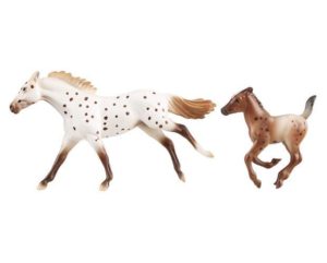 Matte chestnut leopard appaloosa; tan shaded mane and tail; brown legs; 1 hind sock- with Cantering Foal