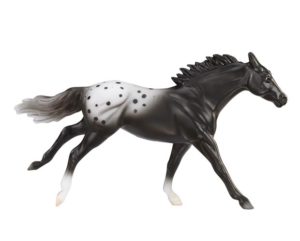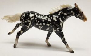 Matte black blanket appaloosa; black splash spots; blaze; bi-color tail; 2 socks; Walmart release
