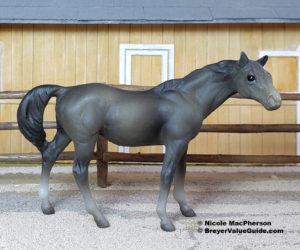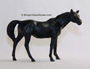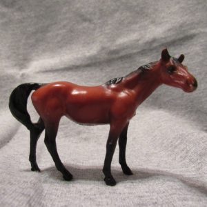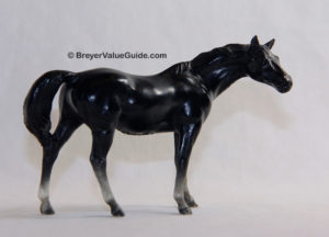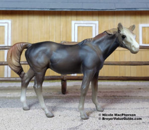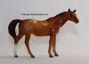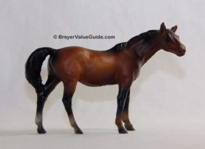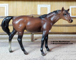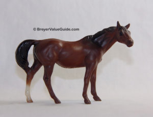 Matte/ semigloss brown bay; darker mane and tail; 1 hind sock; grey hooves; Sears SR